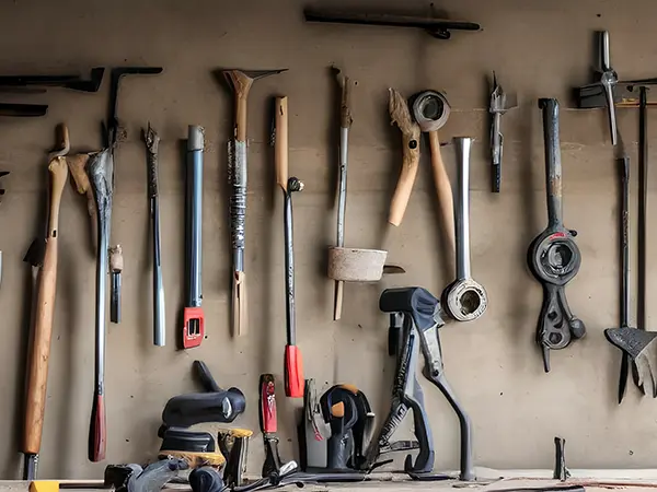 Hooks for different tools on a garage wall